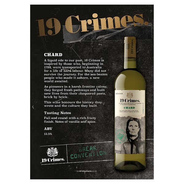 History: Based on Real Historic Events Circa 1800s. A liquid ode to our past, 19 Crimes is inspired by those who, beginning in 1788, were transported to Australia for a life of hard labour. Many did not survive the journey. For the sea-beaten people who made it ashore, a new world awaited. As pioneers in a harsh frontier colony, they forged fresh pathways and built new lives from their chequered pasts, brick by brick. This wine honours the history they wrote and the culture they built.