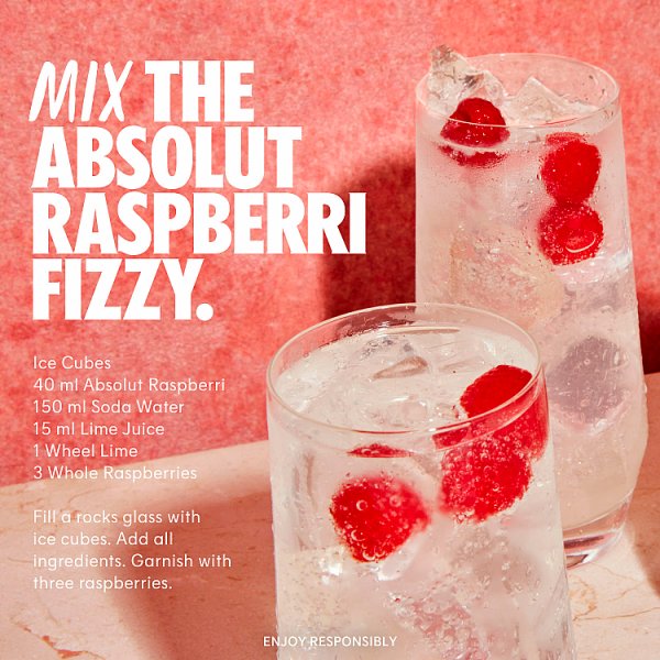 Absolut Raspberri Vodka is rich and intense with the fresh and fruity taste of ripened raspberries harvested in the Swedish hillsides. This raspberry flavoured vodka is made exclusively from natural ingredients, and unlike other flavoured vodkas, it doesn't contain any added sugar, making it perfect for mixing. It can be enjoyed neat, on the rocks or added to a wide selection of drinks and cocktails to enhance the taste.
