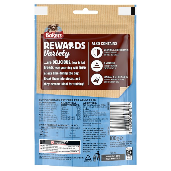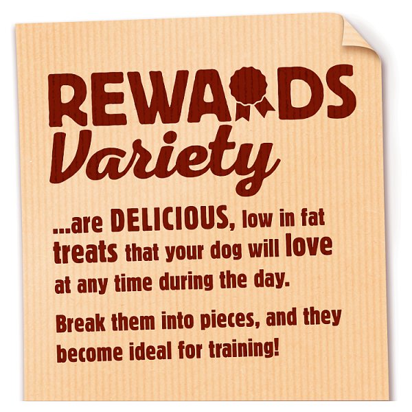 Rewards Variety are delicious, low in fat treats that your dog will love at any time during the day. Break them into pieces, and they become ideal for training!
