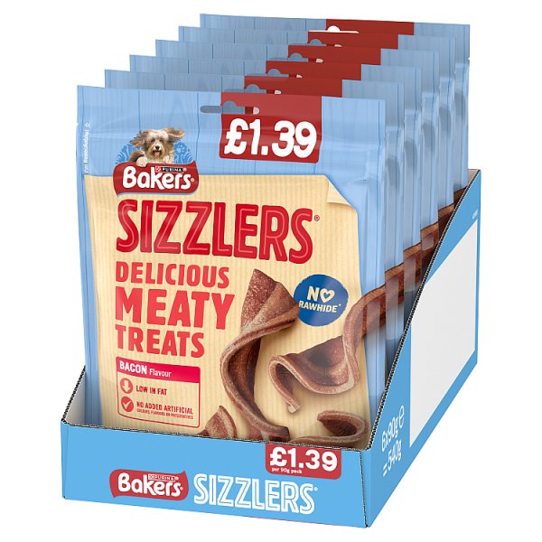 No rawhide* *Treat Sizzlers ...are delicious, chewy, non-rawhide treats that look and taste just like bacon! Sizzlers are low in fat, so ideal at any time as a treat or reward. Also Contains Vitamins & antioxidants to help support natural defences B vitamins to help maintain energy levels Omega 3 & 6 fatty acids to help maintain healthy skin & glossy coat
