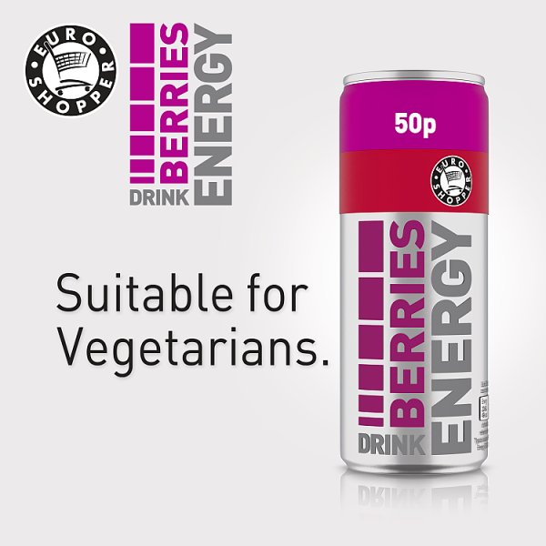 Carbonated berry flavour drink with sugar, sweeteners, B vitamins, taurine and caffeine.